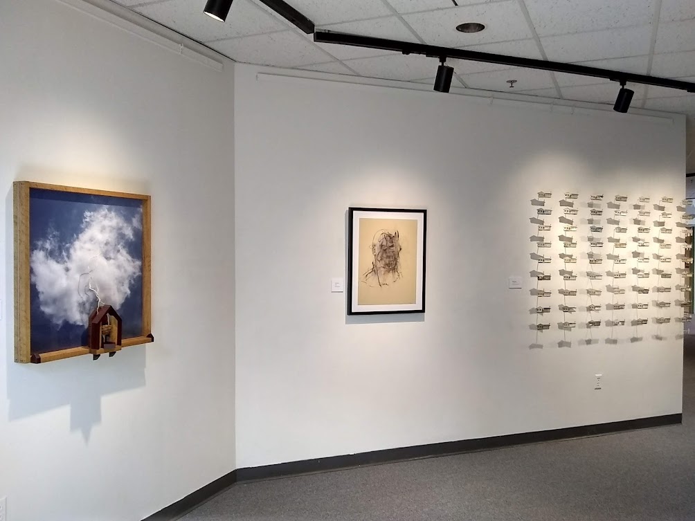 Recker’s mixed media pieces in the show have alludes to home as a recurring theme. Professor Dana Freeman, Chair of the Art Department and director of the gallery, pointed out Recker’s latest piece, Seeking Stillness (see photograph above), which also incorporates photography (and cast shadows) to powerful effect. Another of Recker’s pieces, Longing for the Wholly Other, is dedicated to the memory of one of her friends and includes a bird’s nest she received from him once.