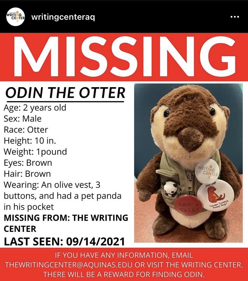 This past week has found the Aquinas College Writing Center consultants ill at ease due to the disappearance of our beloved mascot, Odin the Otter. On the morning of Wednesday, September 15, AQ Writing Center coordinator Julie Bevins messaged the consultant group chat after finding the CORE desk otterless. “Does anyone know where Odin is?” she asked, followed by three crying emojis. Concerned consultants worked together to pinpoint the last known sighting of Odin. The sweet animal was reportedly last seen at a Writing Center shift mid-day on Tuesday. Exactly what happened between then and now is a mystery—but there is compelling evidence that suggests this creature caper is a student at Aquinas.