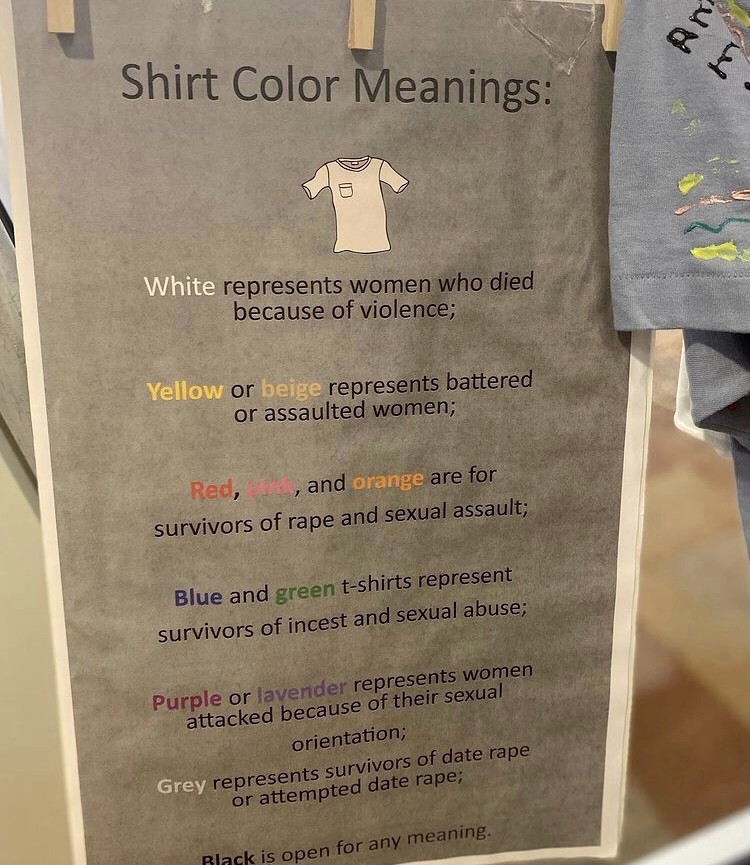 Pictured here are some of the t-shirts and a guide for what each color symbolizes. For example, purple t-shirts symbolize people who experienced domestic violence because of their gender identity or sexual orientation.
