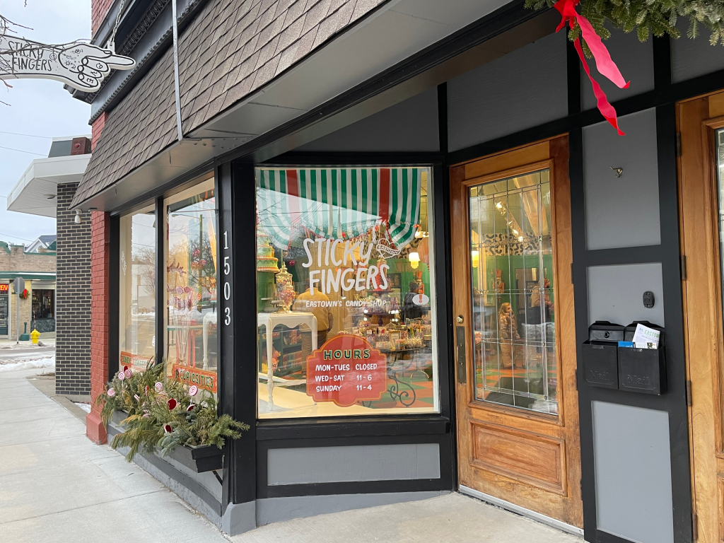 Business has expanded in Eastown, with a new storefront opening just in time for the new year. The candy store, named Sticky Fingers, is located nearby Eastown Antiques, just off Wealthy Street. Sticky Fingers is easily found with their logo pointing to their storefront and bright, colorful window display.