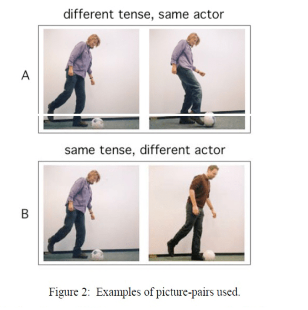 Speakers of English mostly decided the pictures in which different actors were at the same stage of kicking the ball were similar, whereas speakers of Indonesian (which lacks verb tenses ) mostly decided the picture in which the same actor was at different stages of kicking the ball was more similar.