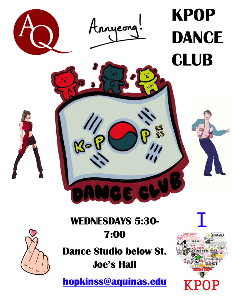 K-Pop Dance meets every Wednesday from 5:30-7 p.m. in the dance studio below St. Joe’s Hall. They meet on a weekly basis so members of the group can master choreography to be ready in the near future. The song the club plans to learn first is “Hello” by Treasure. There is no requirement to perform on stage in this club.