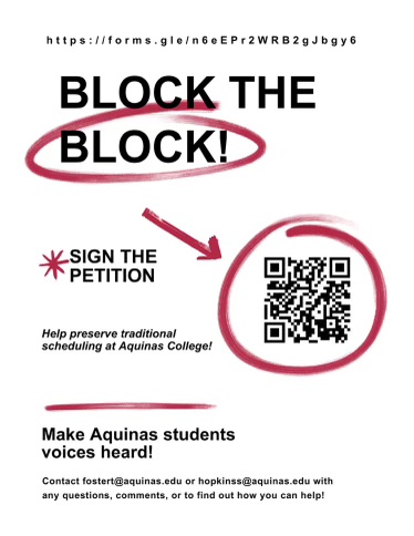 “I am organizing a petition and gathering signatures to advocate for the preservation of traditional scheduling at Aquinas,” said Foster. “If needed, I will also organize a student protest to halt the transition to the block model of scheduling. As current AQ students, we feel that our voices are not being heard. Through reaching out to faculty and collecting signatures, we are trying to make our voices heard and valued. Students can sign the petition by using that QR code. Any questions or comments, can be directed to me at fostert@aquinas.edu.”