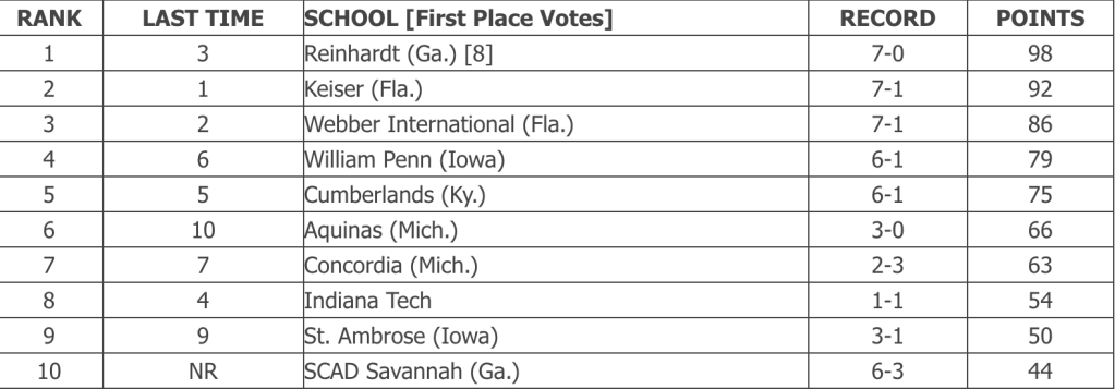 The current NAIA Top 10 is listed below. This week, Aquinas passed (7) Concordia making them the highest-ranked WHAC team. As the season progresses, they will also have to play (8) Indiana Tech and (RV) Madonna who dropped from the rankings this week.