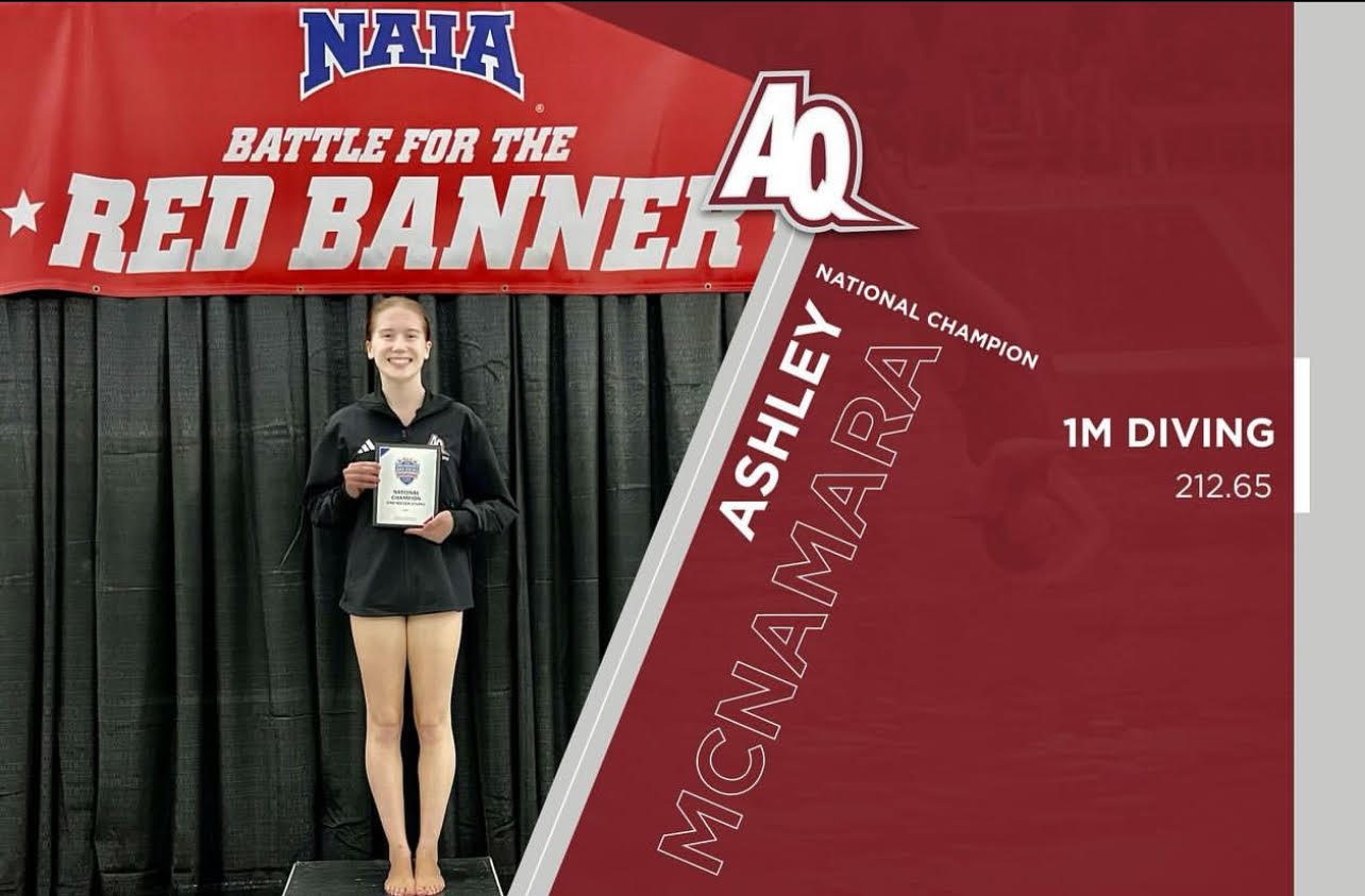 Aquinas College Swim and Dive has their first National Champion in program history. Freshman Ashley McNamara of Strongsville, Ohio took the 1M Board title. This is the first National title between the Men’s and Women’s Swim Program, and the first Aquinas National Champion since Maggie Whitney took the National Title in the Women’s 800m Indoor Track Event.