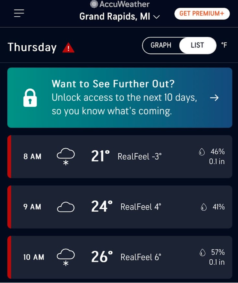 Screenshot of Accuweather predicting real feel temperatures – Photo by: Anastasia Benstead