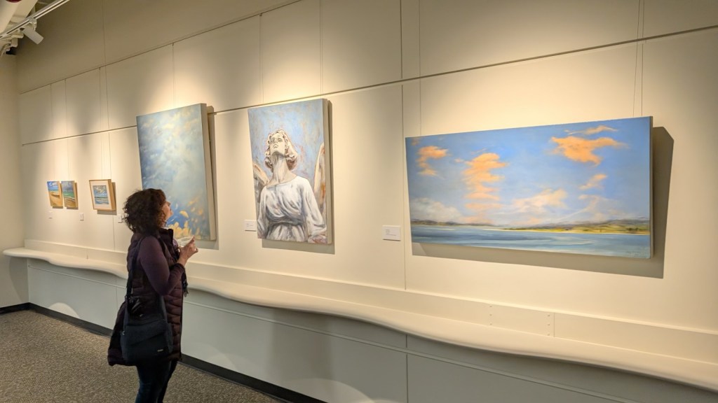 Visitor admiring a painting of a stone angel – Photo by Joel Grimsley