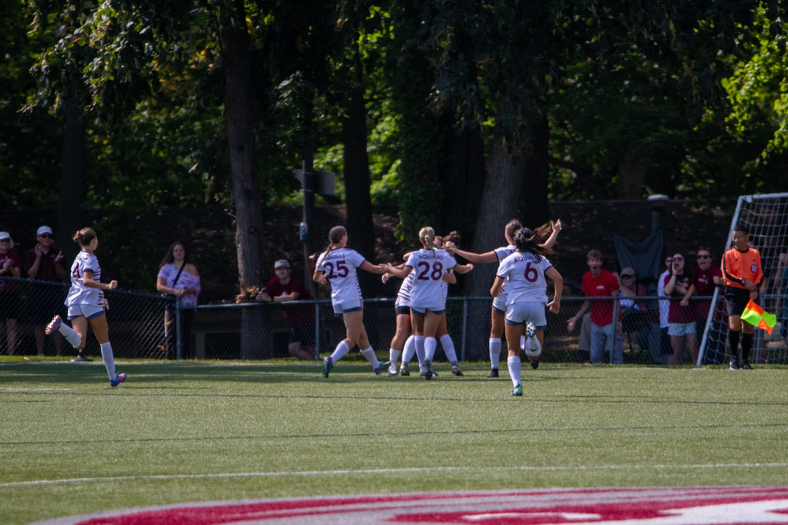 The Women’s Soccer team celebrates the first goal against the Crusaders – Photo by Grace Malec