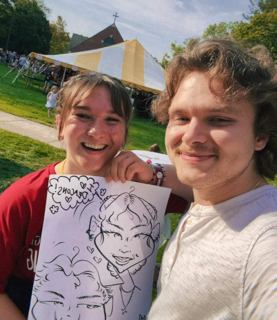 Couple poses with caricature on Holmdene lawn – Photo by Gionna Bean