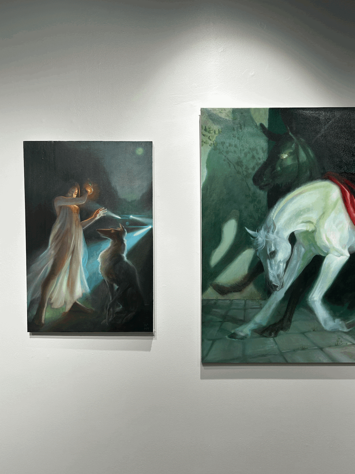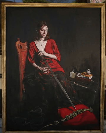 The still life includes items like books (The Lord of the Rings, Twelfth Night, Shakespeare and the Holy Bible), props and artifacts that hold meaning to the couple’s story. In the painting, you can also see The Bells of Ireland lying at Smedley’s feet, a reference to Grimsley’s home. Both Grimsley and Smedley are studying in Ireland this year.