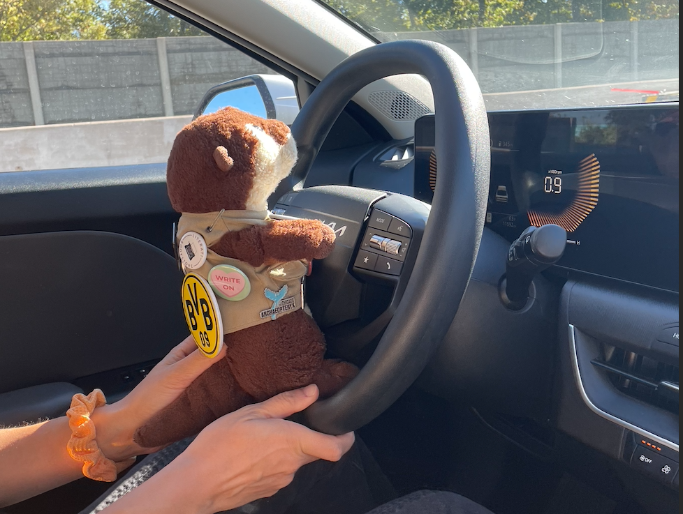 The Writing Center’s trusted mascot also came along for the ride, and their social media even showed him driving the car during part of their journey to Ohio.