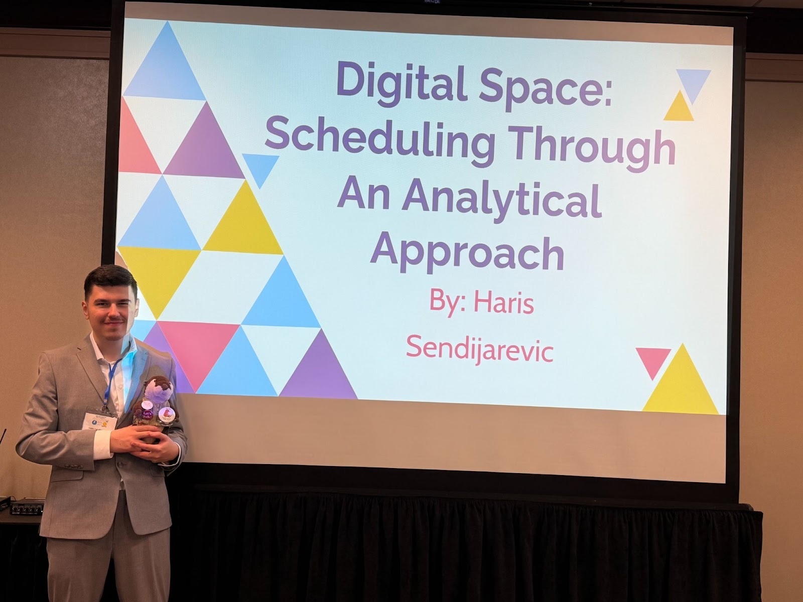 Haris Sendijarevic smiles with Odin before his presentation on Data Analytics and schedule formation – Photo by Julie Bevins
