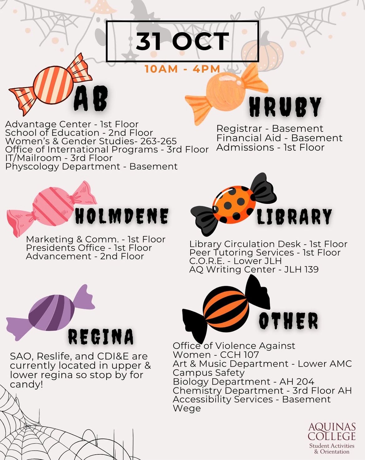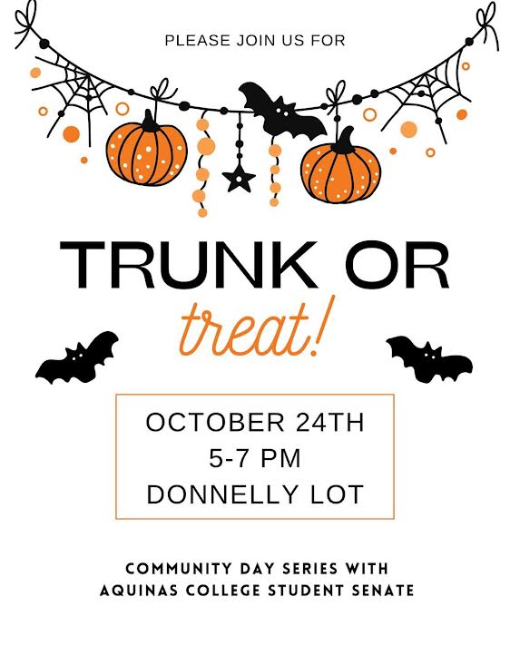 Aquinas hosted several events directly targeted at students trick-or-treating, such as Senate’s trunk-or-treat the week before Halloween, and various departments passing out candy all over campus day of. One team, Women’s Swim and Dive even went trick-or-treating in East Grand Rapids together as one large group.