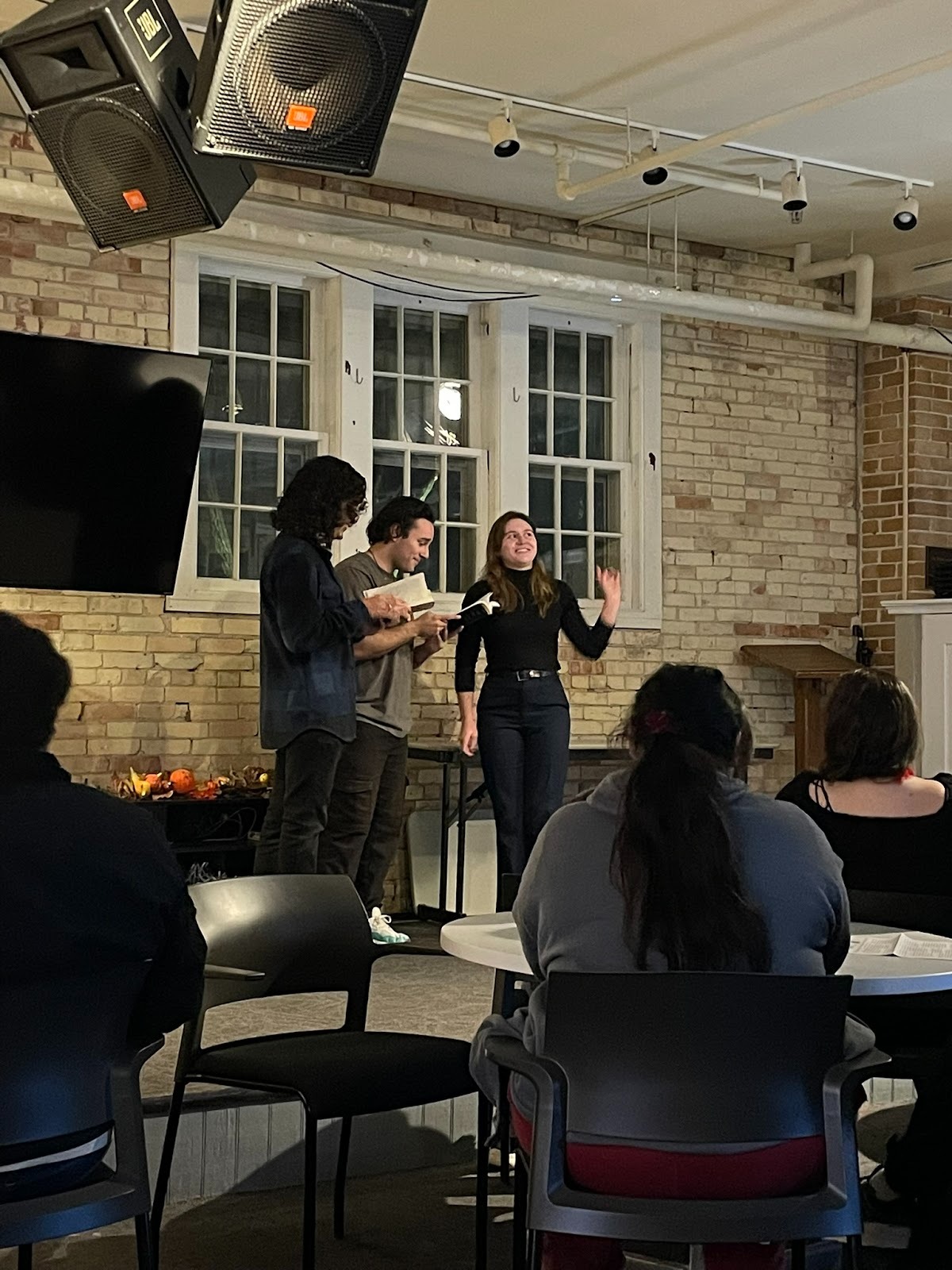 Team Captain Micheala Faith kicked off the show with a game called Quoting Around in which she asked the audience for two books and a prompt. In this game two of the three actors on stage are only allowed to read quotes they find in real time from the two novels. The prompt given was a trip to the zoo and the two texts were Noches at the Fiesta by Kristen Valdez Quade and the other was an inclusion and co-teaching textbook.