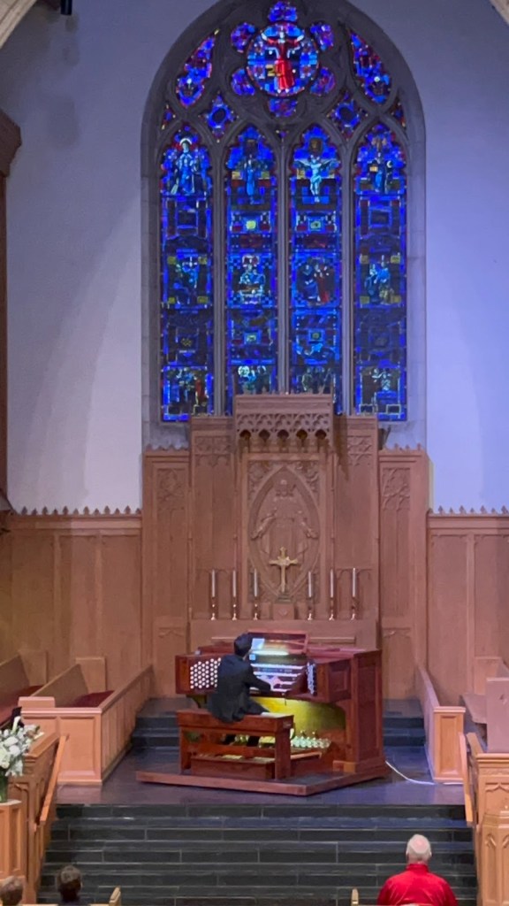 The next few songs he performed included: Prelude in G Minor “Alla Marcia” by Sergi Rachmaninoff, From Evocation, Allegro deciso by Marcel Dupré and then finally an improvisational piece based on the Gospel window in the church’s sanctuary.