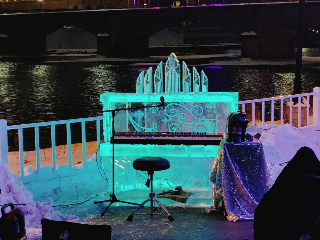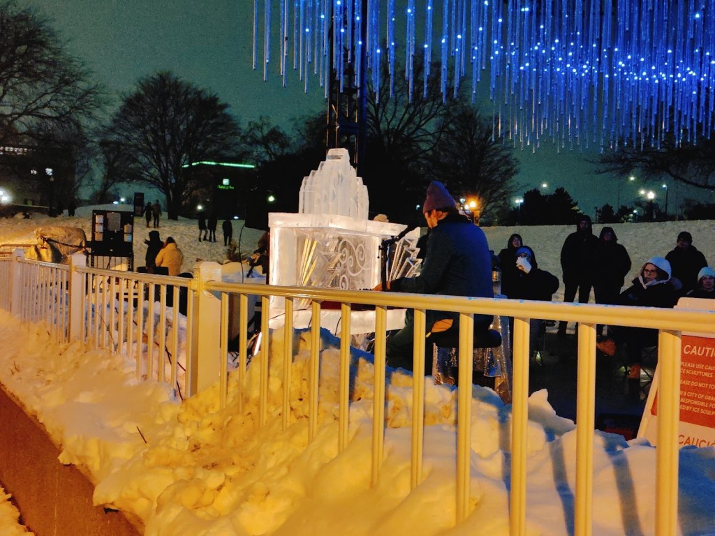 The Ice Piano Performance, conducted on Feb. 5 from 6:30 – 8:30 a.m. at Ah-Nab-Awen Park, was a mixture of visual and lyrical arts, with the two performers Olivia Vargas and Charlie Millard not only playing the piano but also singing covers as well as originals. The two local artists powered through a chilling two hours next to the Grand River marred with technical difficulties. The technology briefly stalled during AQ Alum Vargas’ performance, and Millard improved a sing-along to “Everything You Know Melts Away Like Snow” by Daniel Norgren. The performance was also conducted underneath the art installation “Somnuis,” which changes the music and visuals it produces through the movements of people underneath it. While technicians were working on silencing Somnius, Millard went along with Somnius to play music that mixed well with the ambient noises.