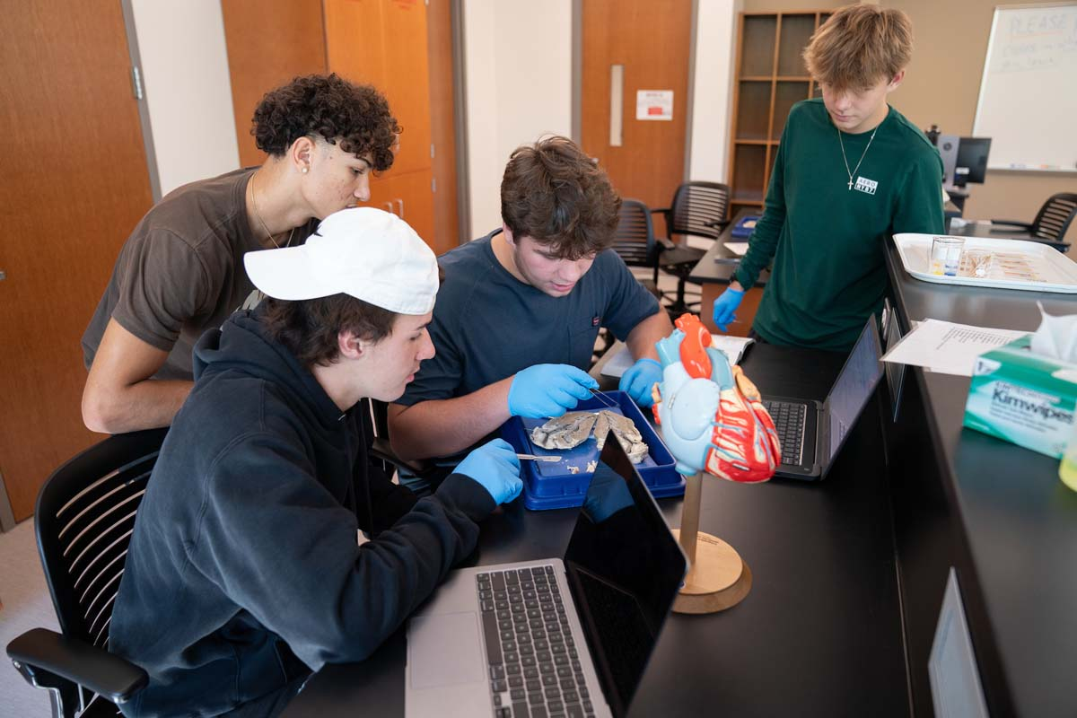 Students in the first cohort of block scheduling dissect a heart in class – photo by Aquinas College