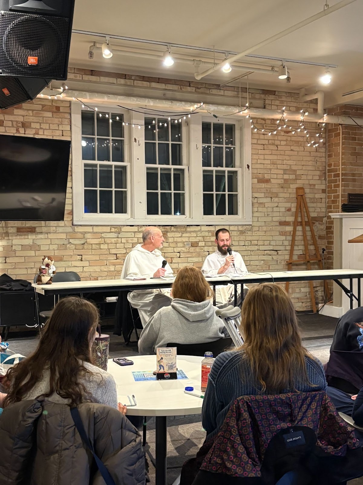 Following Sunday Mass March 23, Campus Ministry held an after-Mass social at the Moose, where Fr. Jordan DeGuire, O.P. and Fr. Robert Keller, O.P. answered questions from the audience pertaining to personal endeavors and theological topics.